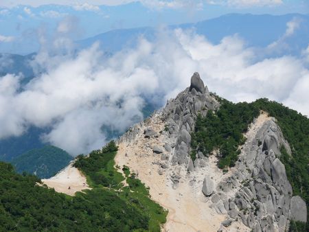 7:00 鳳凰三山巡りに出発 小屋の周りには登・下山道がいくつかあってよく分からないが、標識に従って沢の上流方面に向かう!最初はシラビソの樹林帯の中をジグザグに登っていくが、 やがてざらざらの急坂になって頭上に地蔵岳のあの素晴らしいオベリスクが見えてくる。 8:00 賽の河原 オベリスクの根元で少し遊んでから賽の河原で小休止! ここでは子授けの伝説が今なお生きているのか、真新しい仏像も多い。 それにしても、何とも格好が良くてダイナミックなオベリスク!地元では地蔵仏などと呼ぶそうであるが、オベリスクの語源はギリシャ語の串、「神殿の門前の両 脇に立てられた石造の碑」を表しているそうで、なんとも格好のいいネーミングをしたものだ。 |