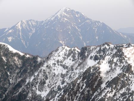 5:30 薬師岳 砂払岳からひと降りで薬師岳小屋。小屋はほとんど雪に埋まっていて、掘り込んだ雪の穴に玄関があるという感じ! 観音岳までの登山道は結構広い記憶であったが、今は積雪のせいでナイフリッジのところが多くところどころでヒヤヒヤした。 6:00 観音岳 天気は悪くはないのだが、春霞というのか?全体にボワーという感じに霞んでいて、本来なら薬師岳方面に見られる富士山もじっと目を凝らせば何んとなく見られる程度、とても写真には写らない!残念である。 適当なところで、下山を開始した。 |